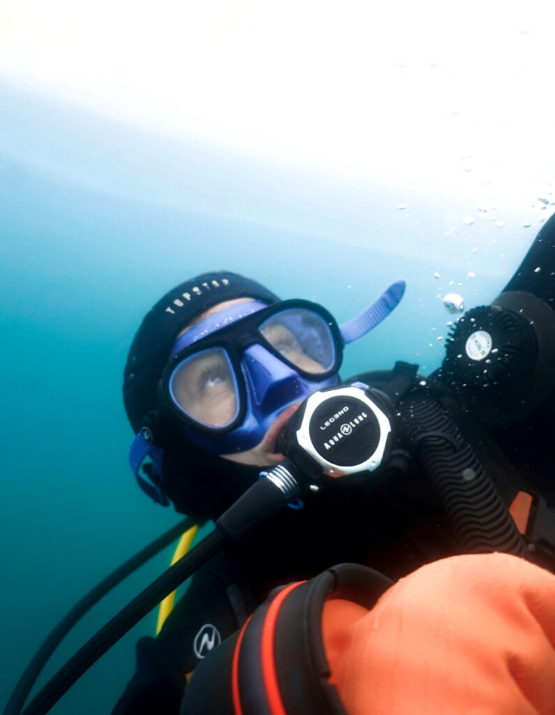 Depuis je collectionne les brevets et aptitudes, DEJEPS E3 bientôt E4, PTH 70, recycleur sur ApDive CcR 70 normoxique, et sur reVo. Je recharge mes batteries sous l’eau lorsque je n’exerce pas mon autre métier : l’orthophonie.